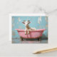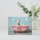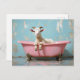 Un cuadro pintoresco con una cabra blanca con cuernos relajante en una bañera rosa vintage, colocada contra una pared azul claro para una agradable y divertida escena rústica.