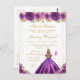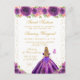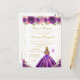 Esta elegante y glamurosa invitación de cumpleaños de dulces dieciséis presenta a una hermosa princesa con cabello rubio y piel clara en un vestido de baile de color púrpura oscuro. El texto combina la escritura a mano y las fuentes modernas sin serif para un aspecto clásico y sofisticado. Los arreglos florales, las mariposas y el confeti dorado crean la mezcla perfecta de rústico y chic.