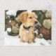 monísimo recuperador dorado amarillo jugando en la nieve contra la pared de piedra de campo con hiedra