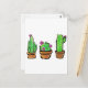 Tres bonitos cactus con flores rosas en pequeñas macetas de terracota - un divertido diseño suroeste. Añadir texto o modificar texto interesante.