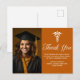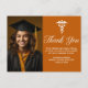 Una tarjeta postal de agradecimiento de graduación de la escuela de medicina personalizada clásica en naranja y blanco para una universidad o universidad de la promoción de 2024. Personalice con el nombre de su escuela y clase de graduación bajo el caduceo y caligrafía para una tarjeta postal de foto de graduado personalizada elegante con su retrato de último año.