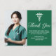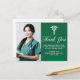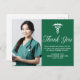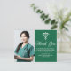 Una clásica tarjeta postal de agradecimiento personalizada para graduación de escuela de medicina en verde y blanco para una universidad o universidad de la promoción de 2024. Personalice con el nombre de su escuela y la clase de graduación bajo el caduceo y la caligrafía para una elegante tarjeta postal de graduación personalizada con su foto de último año.