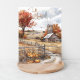 Postal con un ilustracion de un día de otoño en el país con un árbol alto con follaje rojo y hojas caídas en el fondo, un granero de campo rodeado de campos en tonos dorados y naturales y un camino de tierra cercado que conduce a una puerta y matorral de calabazas naranjas en primer plano. El guión Cae en modo hacia la parte superior izquierda de la imagen en un color que coincida con el ilustracion.