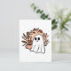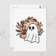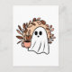 Postal fantasma y café. Cute tarjetas de temporada de otoño. Ilustracion beige, marrón y rosa con un fantasma adorable sosteniendo una taza de café. Cómodas tarjetas estéticas de otoño.