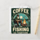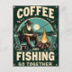 Un ilustracion de estilo retro con un pescador sentado junto a una fogata con una barra de pesca y una taza de café, con el texto Café & Pesshing Go Together en el que destaca el lugar.