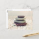 Una postal con una fotografía con piedras apiladas unas encima de otras. Rodeado de rocas blancas sueltas y flores blancas.