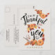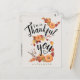 Esta tarjeta postal de Acción de Gracias presenta un diseño otoñal lindo con calabazas naranjas, hojas amarillas, salvia y marrones, y palabras dulces llenas de gratitud en caligrafía moderna manuscrita negra: "Estoy muy agradecido por ti". El nombre en la parte delantera y el texto en la parte trasera son personalizables. Es una forma sincera y reflexiva de mostrar gratitud a sus seres queridos. ¡Pida la suya ahora para un mensaje perfecto de amor y agradecimiento con tema de otoño!