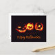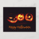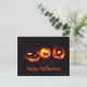 Postal con 3 calabazas talladas de Halloween. Uno con cara de miedo con dientes afilados, un gato curvo y espeluznante y un cráneo sonriente sobre un fondo oscuro.