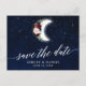 Tarjeta postal de la invitación de compromiso de fecha para guardar celestes. Script de caligrafía moderna. Cielo nocturno azul acuarela con estrellas y luna. Floral rosa azul borgoñona. La vegetación de las hojas de Eucalyptus.