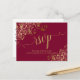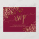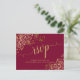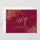 Estas hermosas tarjetas de respuesta RSVP de color rojo burdeos o granate harán que sea fácil para sus invitados responder a su invitación de boda. Presentan un diseño elegante con caligrafía de letra cursiva y rizos y espirales de pan de oro falso floral en las esquinas. La parte trasera es un formulario para que sus invitados lo rellenen y devuelvan indicando el número de asistentes y su elección de comidas. Hay espacio para ingresar una dirección web para que sus invitados puedan responder en línea si lo prefieren. Elegantes y sofisticadas, estas tarjetas de respuesta RSVP son un complemento maravilloso para su suite de invitaciones.