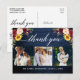 Caligrafía Moderna, Floral Acuarela Elegante Burgundy Marsala, Tarjeta Postal de Agradecimiento de Boda con 3 Fotos incluye rosas burgundy, rosas rojas, rosas rosadas, girasoles y follaje. Madera Azul Rústica.