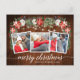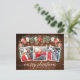 Moderno y elegante guión de caligrafía, acuarela floral de invierno, hilo de luces de cadena Pareja 3 Fotografía La postal navideña incluye poinsettias rojas acuarelas, rosas blancas, bayas huecas, conos de pino y vegetación botánica. Madera rústica.