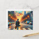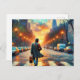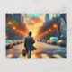 Esta imagen representa una pintura artística y colorida de una persona caminando por una calle de la ciudad en lo que parece ser puesta de sol o amanecer. El individuo se centra en la composición, con un abrigo largo y un gorra, llevando un funda de guitarra. La calle está bordeada de coches aparcados y está iluminada por lámparas de calle, con edificios a ambos lados. El cielo está en llamas con cálidos tonos de naranja, amarillo y azul, lo que sugiere el comienzo o el fin del día.