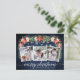 Moderno y elegante guión de caligrafía, acuarela floral de invierno, hilo de luces de cadena Pareja 3 Fotografía La postal navideña incluye poinsettias rojas acuarelas, rosas blancas, bayas huecas, conos de pino y vegetación botánica. Madera Azul Rústica.