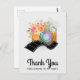 Una tarjeta de agradecimiento con una ilustración de acuarela de una cámara naranja con un ramo floral y una tira de película ondulada en blanco y negro.