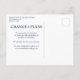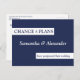 Hágase saber a sus huéspedes que ha pospuesto su boda con postales modernas de color azul marino minimalista con bloques de color geométrico blanco, uno que se extiende desde la parte superior izquierda con las palabras "cambio de planes" y el otro desde la parte inferior derecha con su mensaje personalizado en cursiva azul marino. Los nombres de la pareja están en el centro en blanco. La parte posterior incluye una dirección de retorno impresa por el personalizado y un mensaje personalizado más largo en texto naval sobre fondo blanco. Personalice el texto en la barra lateral. ©Claire E. Skinner, Todos Los Derechos Reservados.