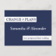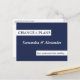 Hágase saber a sus huéspedes que ha pospuesto su boda con postales modernas de color azul marino minimalista con bloques de color geométrico blanco, uno que se extiende desde la parte superior izquierda con las palabras "cambio de planes" y el otro desde la parte inferior derecha con su mensaje personalizado en cursiva azul marino. Los nombres de la pareja están en el centro en blanco. La parte posterior incluye una dirección de retorno impresa por el personalizado y un mensaje personalizado más largo en texto naval sobre fondo blanco. Personalice el texto en la barra lateral. ©Claire E. Skinner, Todos Los Derechos Reservados.