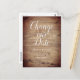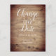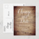 Esta tarjeta de cambio de fecha de boda de madera rústica presenta un elegante cambio de escritura nuestra fecha encima de sus detalles establecidos en tipografía moderna elegante en un fondo de paneles de madera rústica. El reverso tiene detalles adicionales, incluyendo su sitio web de boda, con su dirección de devolución y espacio para la dirección de su destinatario. Diseñado por Thisisnotme