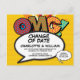 Personaliza con tus nombres y detalles para anunciar el cambio de fecha de tu evento especial. Tema de arte pop de cómic moderno, divertido diseño retro, perfecto para bodas, fiestas de compromiso, baby showers, bautizos, celebraciones de aniversario, graduaciones, fiestas de cumpleaños y otros eventos especiales durante todo el año. Un diseño fresco, moderno y divertido que pone emoción en tu día. Diseñado por Thisisnotme