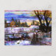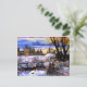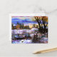 Niño, Chica y perro en camino invernal a casa con luces de Navidad, rodeados de árboles, hombre de nieve en el patio delantero, ciervo por árbol de Navidad decorado, gansos en la nieve, campos y montañas y un cielo al atardecer.