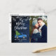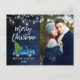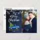Camión de color de agua rústico de madera con árbol de Navidad - Postal de foto de la pareja de navidad con luces de cadena de macarrones. Camión Azul, Madera Azul.