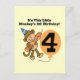 Camisetas de cumpleaños, tazas, tarjetas, pegatinas, bolsas y más con un mono lindo en una fiesta que lleva una gran vela y un texto que dice "¡Es el cuarto cumpleaños de este pequeño mono!".