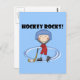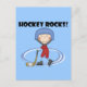 Camisetas, tazas, imanes, tarjetas, pegatinas, bolsos de té, caramelos y más con una figura de bastón, jugador masculino de hockey con patines, bastón de hockey y casco y texto que dice "¡Rocas de hockey!".