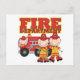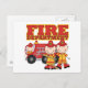 Camisetas del Departamento de Bomberos, bodysuits, bolsas de mano, tazas, imanes y otros artículos de bomberos con una bomba de incendios roja y varias figuras de bomberos de palo.