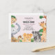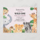 Un elegante campo de la selva temática la primera invitación de cumpleaños en acuarela que representa una escena de selva tropical salvaje completa con una colección de lindos animales salvajes contra un fondo lluvioso rosa claro y blanco. Este tema incluye animales salvajes y aves como elefante, chita, jirafa, cebra, mono, tocano y avestruz enmarcando la carta. La tarjeta presenta una tipografía y fondo de textura única de personalizado 'Wild One'. El color de fondo se puede personalizar según sus necesidades.