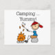 Un chico con figuras de palos arroja perritos calientes sobre una fogata y el texto dice "Camping is Yummy" sobre el diseño de camping camisetas, tazas, tarjetas, pegatinas, bolsos de té y otros artículos, perfecto para cualquiera cuya parte favorita del camping son perritos calientes cocinados en una fogata abierta!