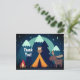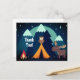 Esta tarjeta postal de Camping Gracias. contiene una tienda, una fogata, un búho y un alce bajo un cielo alto con luna llena y montañas al fondo.