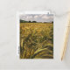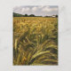 Esta postal de fotografía de arte fino presenta un paisaje de verano pintoresco de un campo de oro madurante, grano marrón y amarillo, casi listo para la cosecha. Los edificios de la granja y los graneros están muy lejos. Los tallos soplan en el viento para formar un hermoso patrón abstracto.