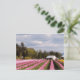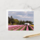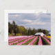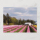 El campo de tulipanes rosas con edificios agrícolas, árboles y las estribaciones que retroceden por el valle de Skagit hace una hermosa y única pieza de arte fotográfico floral.