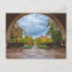 La imagen muestra un patio en la Universidad de Stanford, visto a través de un arco de piedra. El patio está decorado con baldosas de piedra a cuadros, con mesas de picnic de madera y bancos repartidos por todos lados. Árboles con follaje otoñal en tonos verdes, amarillos y naranjas rodean el patio.