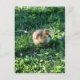 Esta adorable chica de ganso canadiense es amarilla y ondulada. Está iluminado por la luz del sol sobre un césped adornado con pequeñas flores rosadas y violetas.
