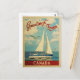 Este diseño náutico vintage de Greetings From Canada incluye un barco que navega en el agua con gaviotas y un cielo azul lleno de hermosas nubes blancas.