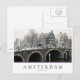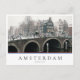 Foto postal de un canal con un puente, casas tradicionales y bicicletas bajo cierta nieve en invierno en la capital holandesa, Ámsterdam, Holanda con el texto 'Ámsterdam, Holanda' en una caja blanca y con rayas en rojo, blanco y azul, los colores de la bandera holandesa.