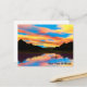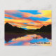 Una canoa cruza un lago montañoso que refleja los hermosos naranjas y azules de una colorida puesta de sol. Añade tu propio texto.