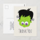 Tarjeta de agradecimiento con una adorable cara de monstruo de frankenstein. Tiene ojos grandes y una pequeña sonrisa con una cicatriz en la frente. Tornillos clásicos que sobresalen de los lados de su cabeza. Este tipo es realmente lindo y nada aterrador.