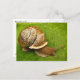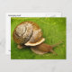 Esta postal muestra un caracol de jardín que emerge de su caparazón en una hoja verde. Es un molusco gasterópodo terrestre con una concha marrón y beige en el patrón espiral clásico. Sus tentáculos cada uno tienen un ojo al final y apuntan hacia delante mientras se da cuenta hacia dónde ir, empujados por su fuerte pie muscular.