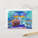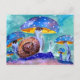 arte acuático tradicional de setas azul surrealista y caracol morado con una cáscara de espiral en una postal.