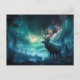 Un caribú se alza en una colina, rodeado de altos árboles verdes. Debajo hay un lago, cubierto de bruma y niebla. Encima hay un cielo estrellado, iluminado por una magnífica exposición de las luces del norte, brillando en rojos, amarillos y azul neón, con un resplandor verde difuso por todos lados.