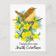 Una postal de "pensando en ti desde Carolina del Sur" decorada con un pájaro de la hierba de Carolina en un arbusto florido de Jessmine amarillo, ilustrado con tinta y acuarela. Inspirado por el ave estatal y flor estatal de Carolina del Sur. Puede editar o eliminar el texto para que se ajuste a sus necesidades.