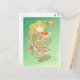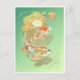 Postal con dos carpas koi en ilustracion de nenúfares. Colores verdes, amarillos, naranjas y dorados.