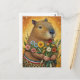 Una divertida ilustración de estilo arte popular de un carpincho con un ramo de flores, la tarjeta postal perfecta para cumpleaños y otras felicitaciones para mostrar tu amor a un amante de los roedores.