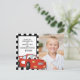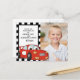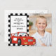 Cuta foto de cumpleaños de niño pequeño, carta de agradecimiento con un fondo negro y blanco a cuadros y un auto rojo de carrera. Esta tarjeta es completamente personalizable, así que agrega tu foto y coloca tu texto en los espacios proporcionados. Para un control más creativo, utilice el botón "Personalizar" para cambiar la fuente, el tamaño de la fuente o el color.