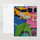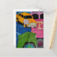 A mixed media collage by the artist Angelandspot and photographed by Angelandspot with vintage children's book pages that I randomly used in a bright colored collage and then used pastels, highlighters, and paints on to make random marks. A yellow car, a street sign, a green truck, and a pink truck on a blue background