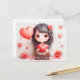 Playful Valentine’s Day illustration featuring a cartoon-style girl surrounded by red and pink hearts and blooming roses. With large expressive eyes and flowing hair, she radiates charm and affection. The soft, romantic background makes this design ideal for greeting cards, posters, and seasonal gifts.