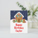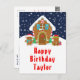 Esta linda y festiva tarjeta postal de cumpleaños se puede personalizar con un nombre o título como hijo, nieto, sobrino, amigo, etc. El diseño presenta una linda casa de pan de jengibre decorada con dulces de Navidad rojos y verdes. Al lado hay adorables hombres de pan de jengibre con regalos, vestidos con sombreros y bufanda de Santa. Al fondo hay un cielo invernal azul marino con elegantes copos de nieve que caen. El texto está en una fuente negrita y festiva. Esto es perfecto para la Navidad y las fiestas de invierno.