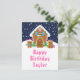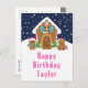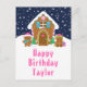 Esta linda y festiva tarjeta de cumpleaños se puede personalizar con un nombre o título como hija, nieta, sobrina, amiga, etc. El diseño presenta una linda casa de pan de jengibre decorada con dulces de Navidad rosados y verdes. Al lado hay adorables hombres de pan de jengibre con regalos, vestidos con sombreros y bufanda de Santa. Al fondo hay un cielo invernal azul marino con elegantes copos de nieve que caen. El texto está en una fuente negrita y festiva. Esto es perfecto para la Navidad y las fiestas de invierno.